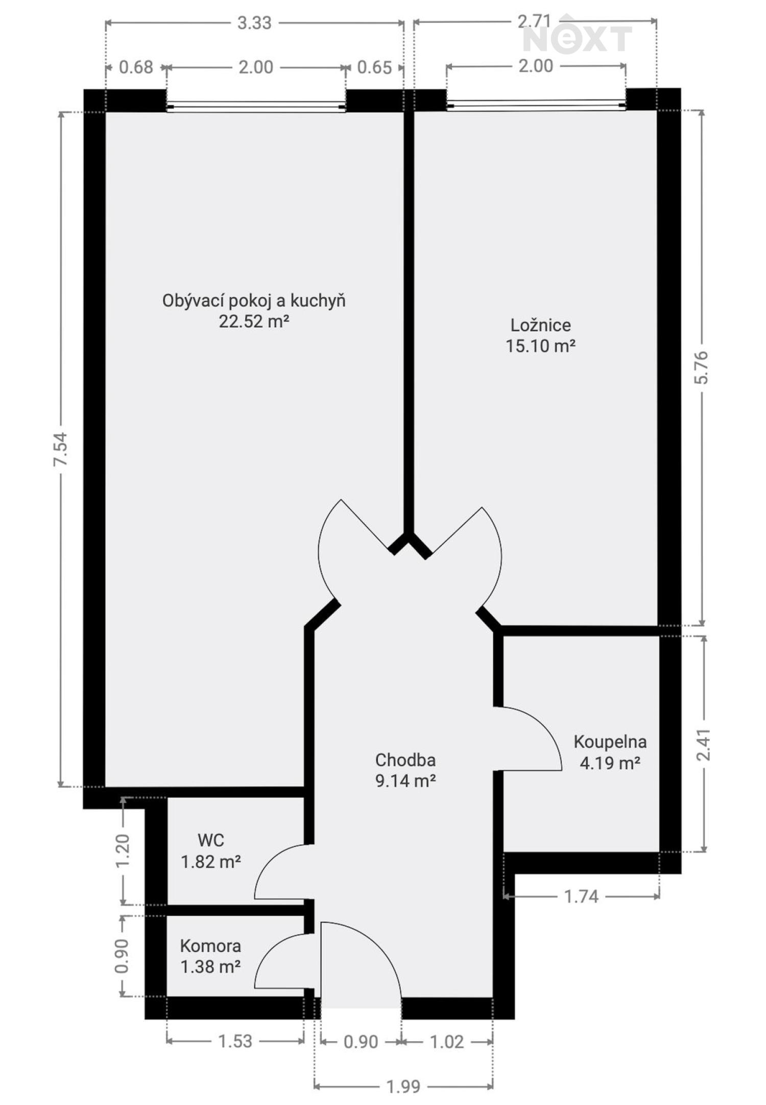 Bytová jednotka nabízí nejen dostatek světla, ale díky prostorné vstupní chodbě s vestavěnými skříněmi a komoře i mnoho úložných prostor. Z této chodby vedou samostatné vstupy do všech dalších místností.