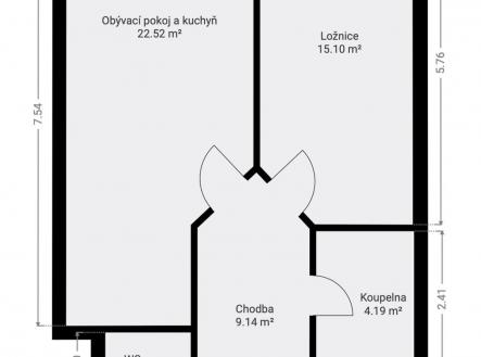 Byt má vzdušný obývací pokoj propojený s plně vybaveným kuchyňským koutem o velikosti 22,3 m2 ( 16,45+5,85). Dále se zde nachází ložnice ( 16,3 m2 ), koupelna s vanou ( 4,5 m2 ), toaleta s umyvadlem ( 1,6 m2 ) a komora (1,5 m2 ).