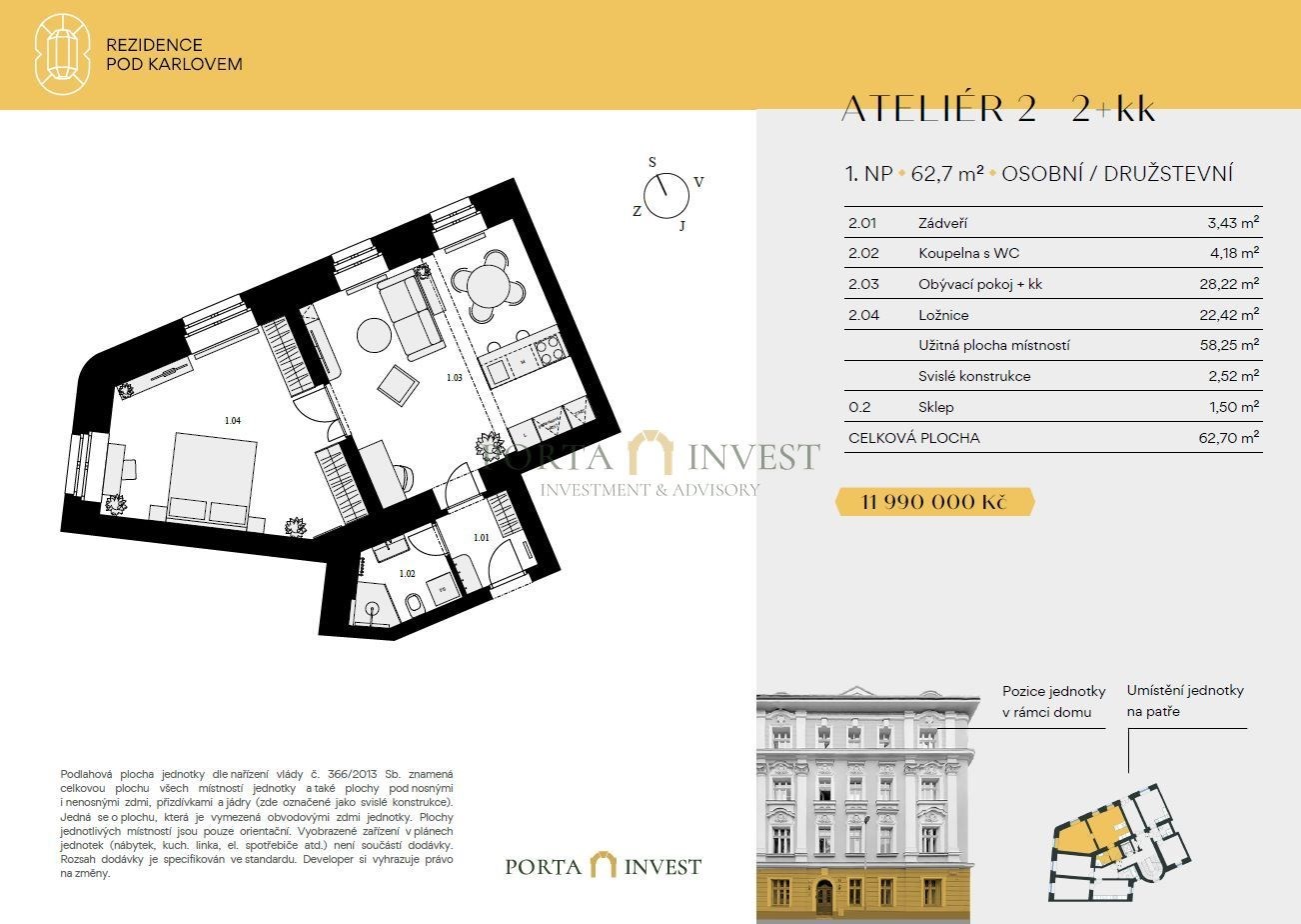 ateliér 2+kk o rozloze 61,2 m² v exkluzivní Rezidenci Pod Karlovem.