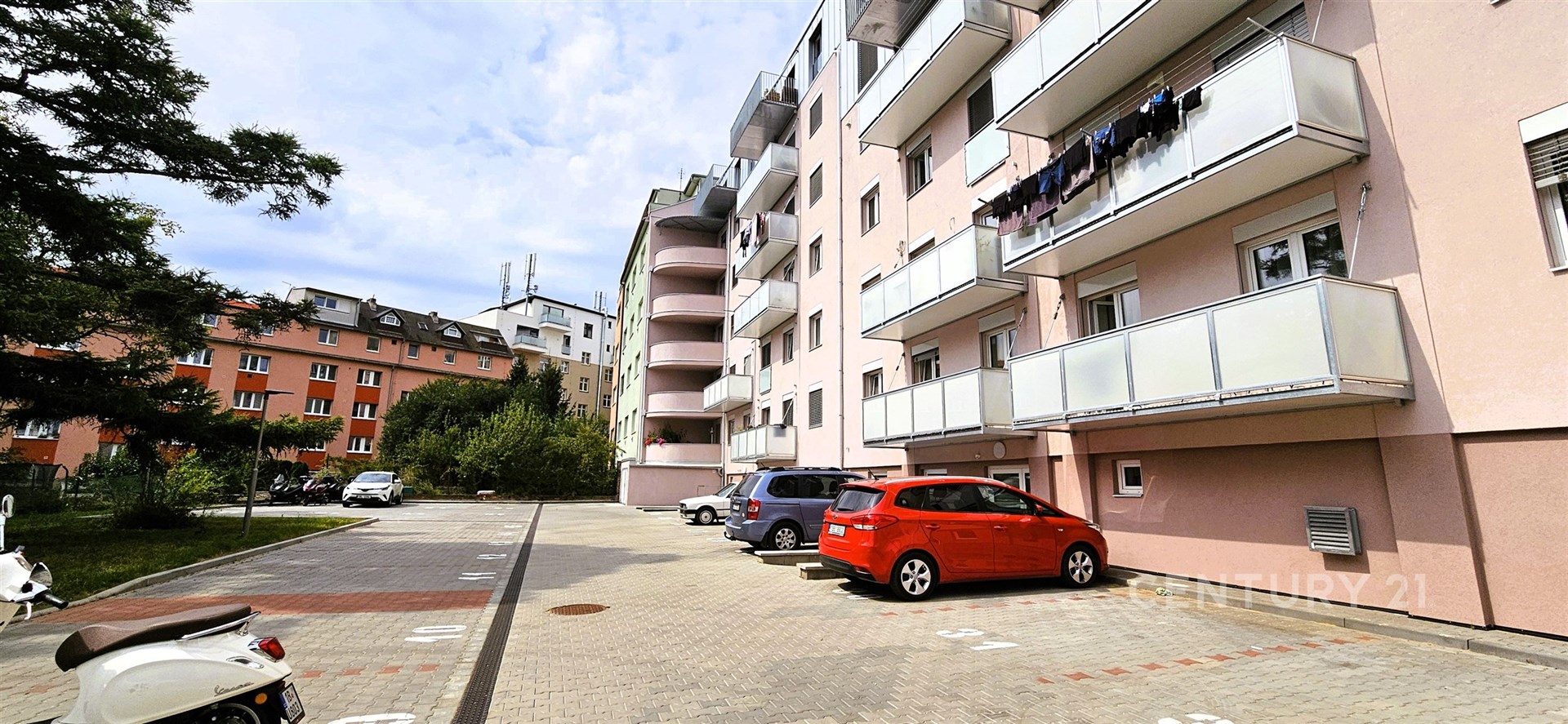 Vytápění je řešeno plynovou kotelnou v domě. K bytu náleží prostorný sklep s oknem. V přízemí domu je kolárna, kočárkárna, společenská místnost a také možnost využívat WC a sprchu. Velkou výhodou je uzavřený dvůr, který je zčásti využit na parkování a z části jako odpočinkový prostor se zelení a dětským hřištěm.