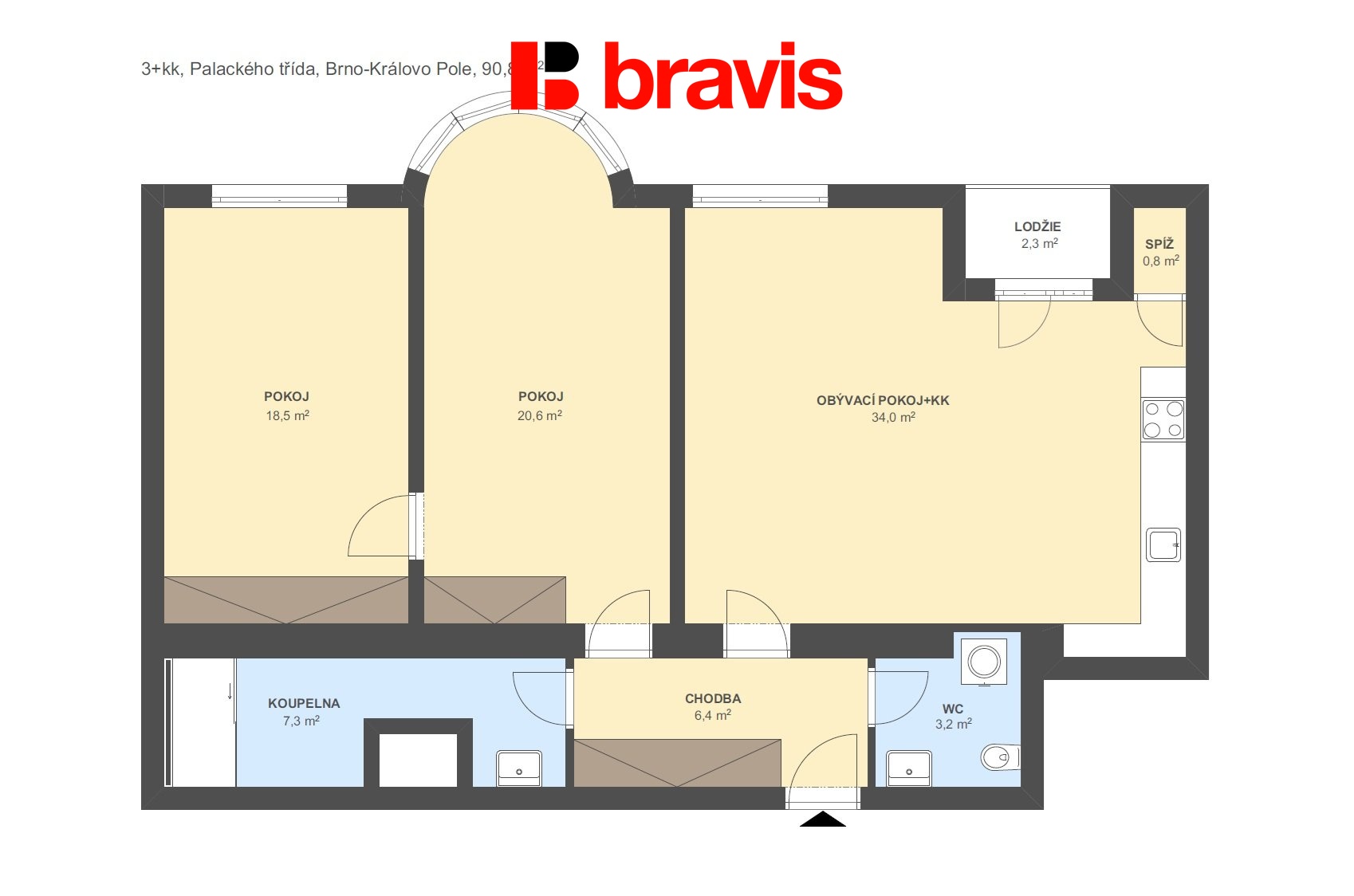 Dominantou bytu je prostorný obývací pokoj s kuchyňským koutem na míru, vybavený kvalitními vestavnými spotřebiči – indukční varnou deskou, elektrickou troubou, myčkou, lednicí s mrazákem a praktickou spíží. Z kuchyňské části je vstup na lodžii o velikosti 2 m², která poskytuje příjemné místo pro ranní kávu nebo odpočinek po práci.