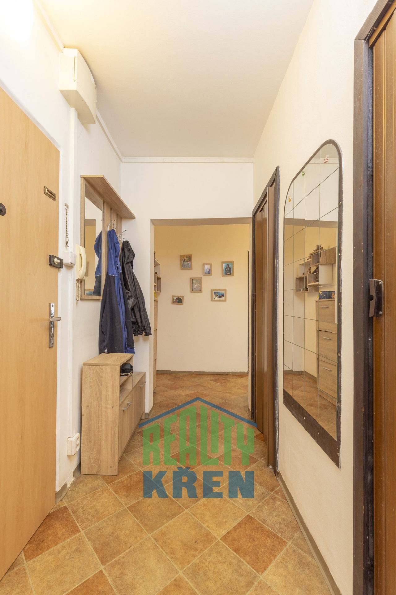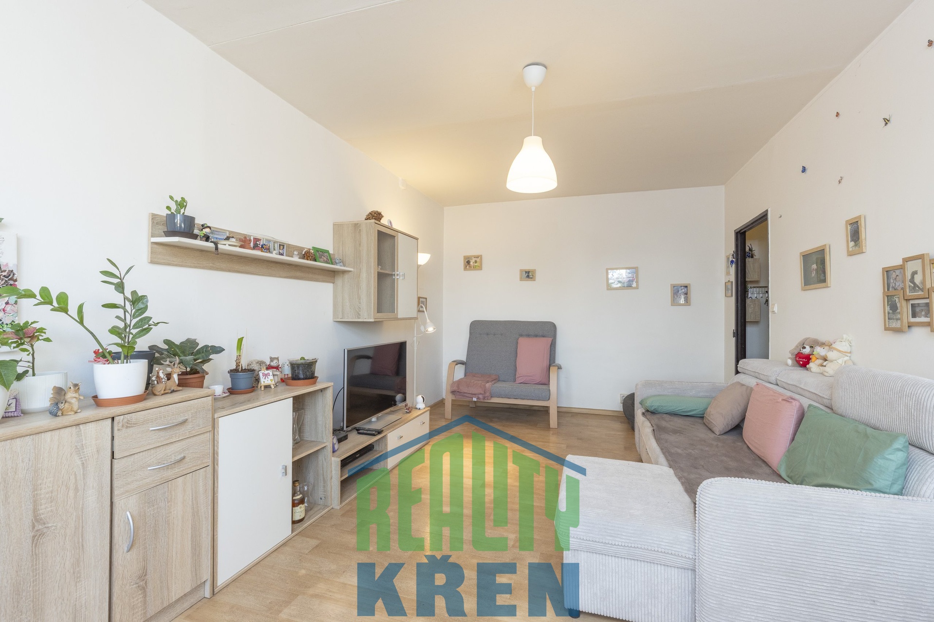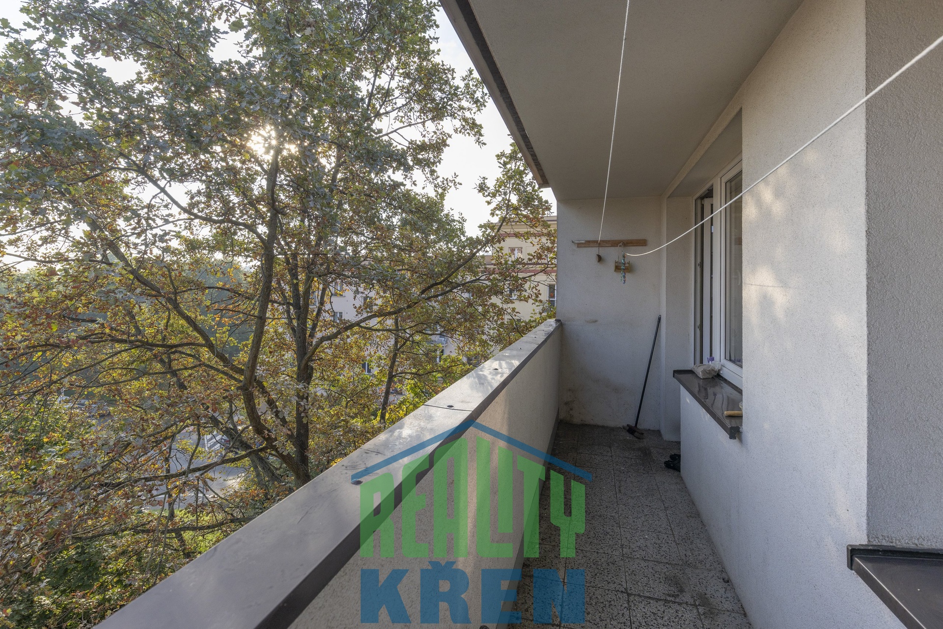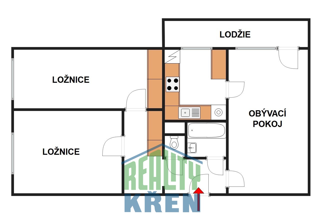 předsíň, obývací pokoj se vstupem na lodžii, kuchyně, 2x ložnice, koupelna s vanou, samostatné WC. K bytu náleží sklepní kóje 2,2 m2 a za nízký poplatek lze pronajmout komoru na patře.