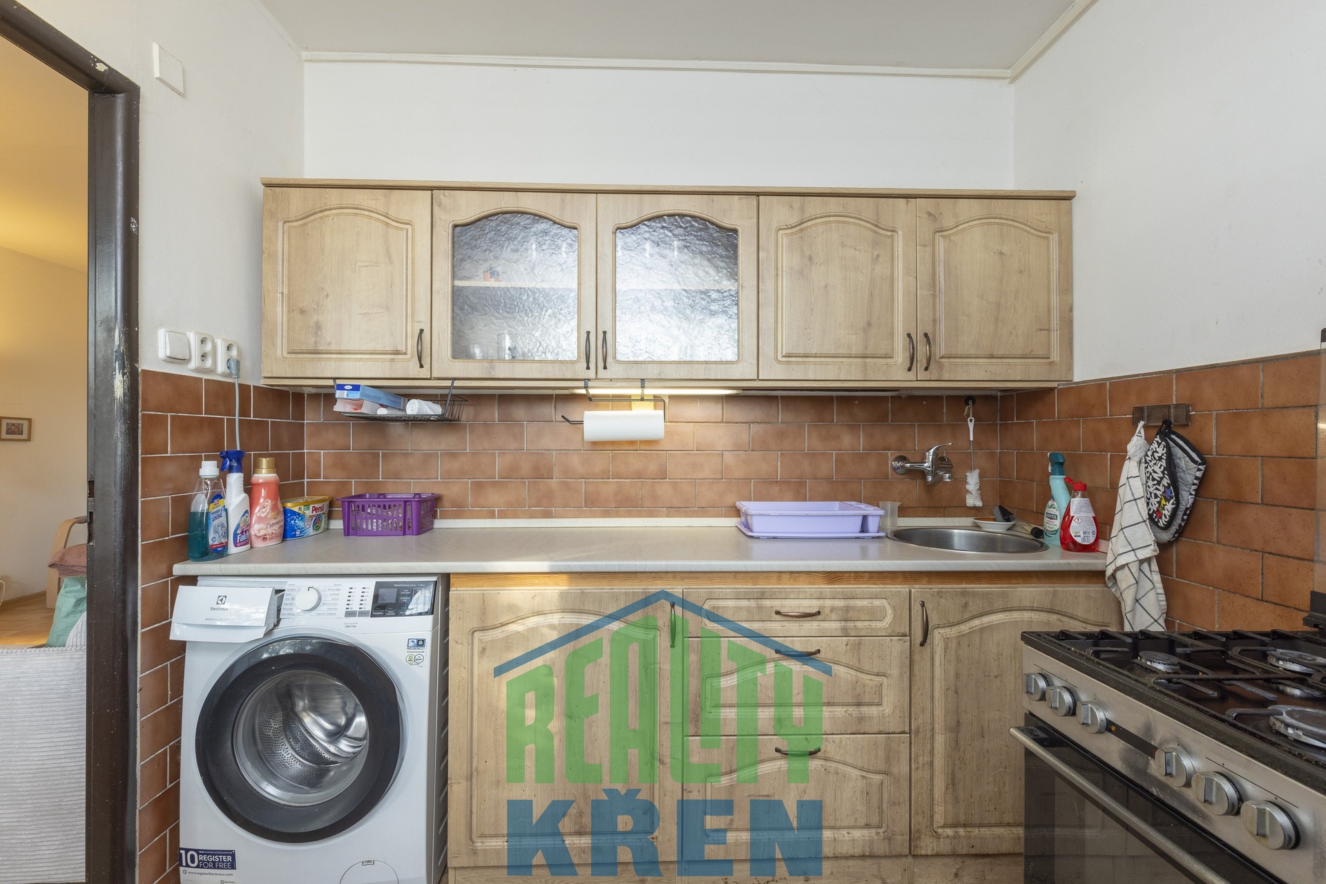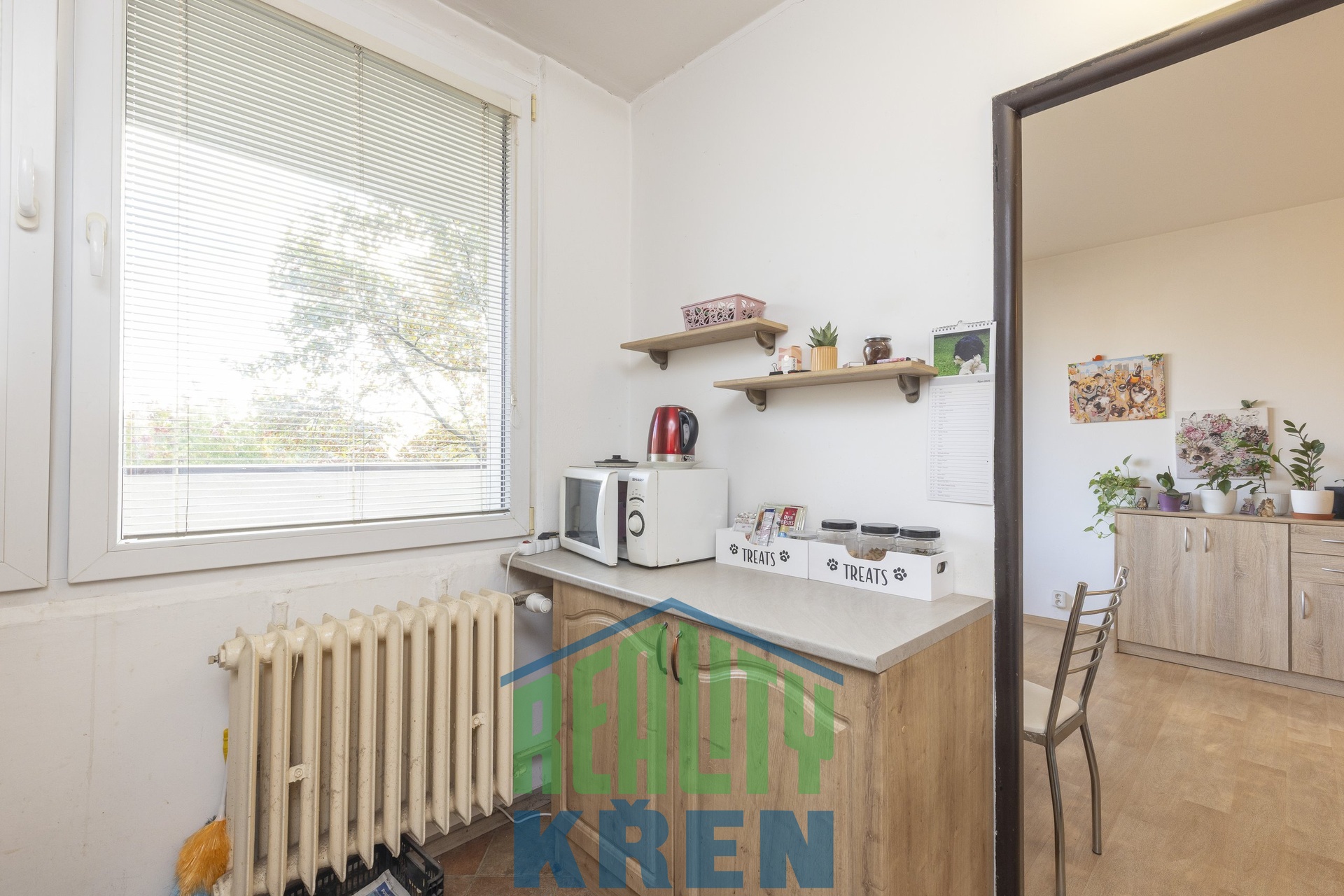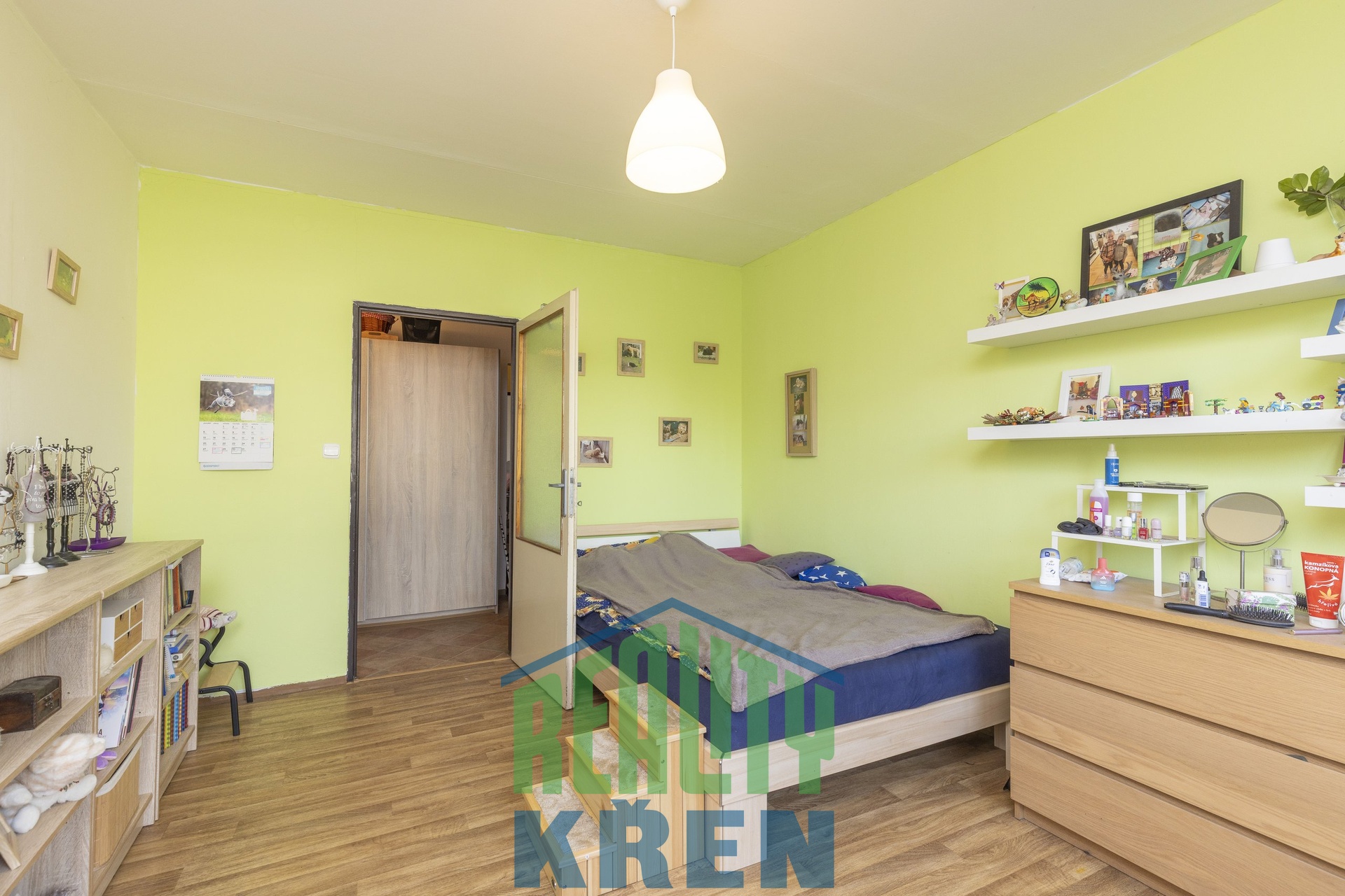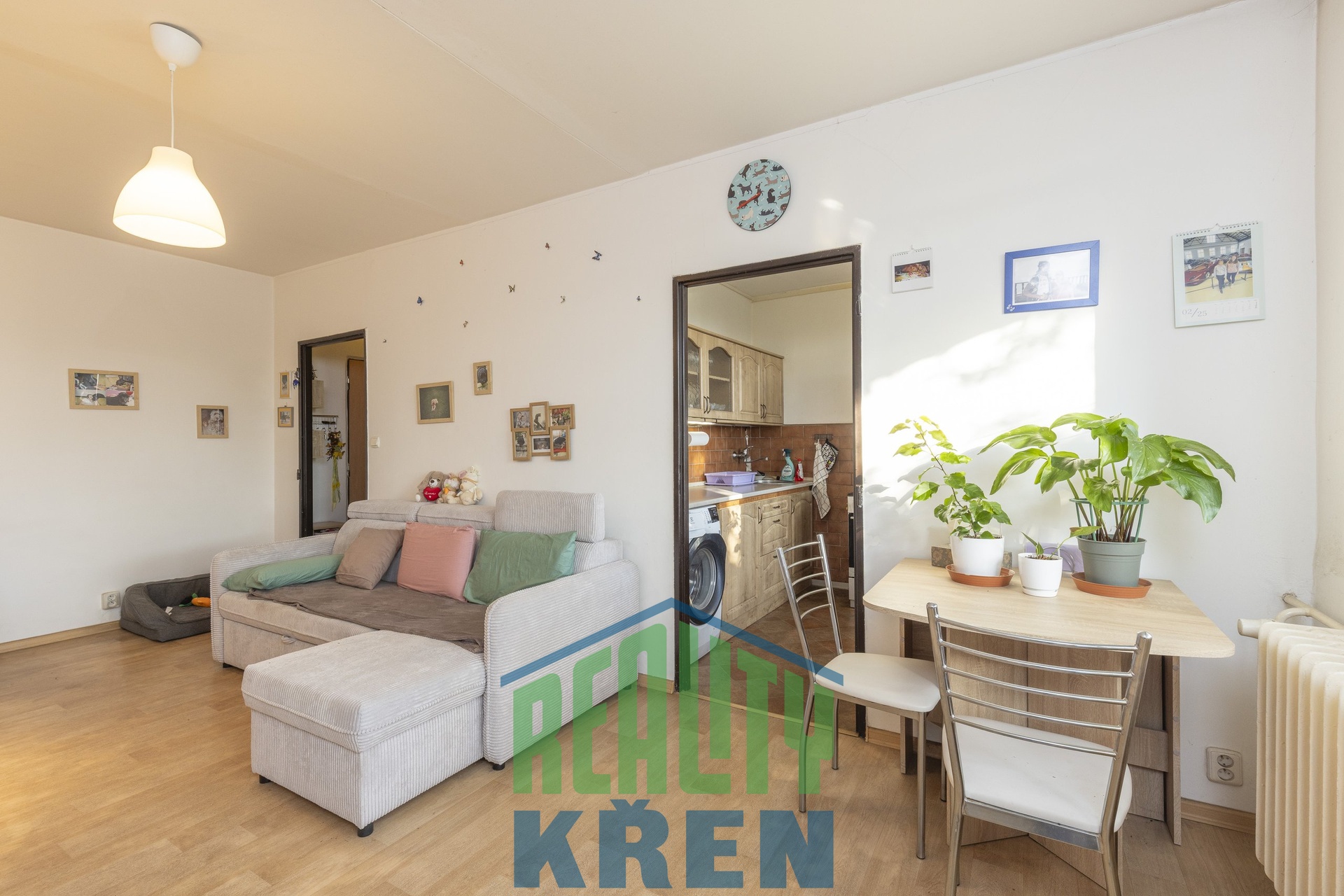 předsíň, obývací pokoj se vstupem na lodžii, kuchyně, 2x ložnice, koupelna s vanou, samostatné WC. K bytu náleží sklepní kóje 2,2 m2 a za nízký poplatek lze pronajmout komoru na patře.