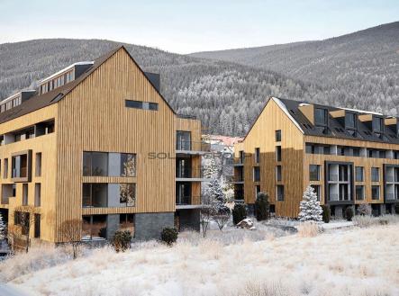Prodej nového apartmánu 3+kk/, 171,3 m² (byt o výměře 91,44 m² + terasa o výměře 36,70 m² + předzahrádka o výměře 43,16 m²), který se nachází v 1. NP cihlové novostavby v rezidenci ZORA Harrachov, Krkonoše (Dům A)