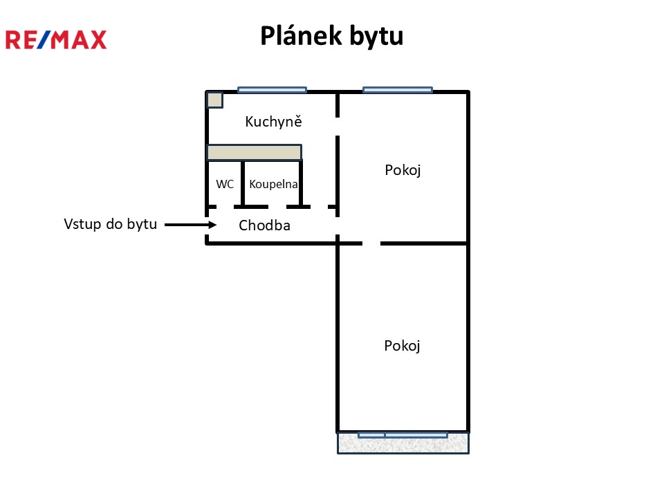 - Dispozice: vstupní předsíň, centrální chodba s vestavěnou skříní, kuchyň s menší linkou (přístup z chodby i obývacího pokoje), obývací pokoj, druhý velký pokoj s balkonem, zděná koupelna se sprchovým koutem a samostatné WC.