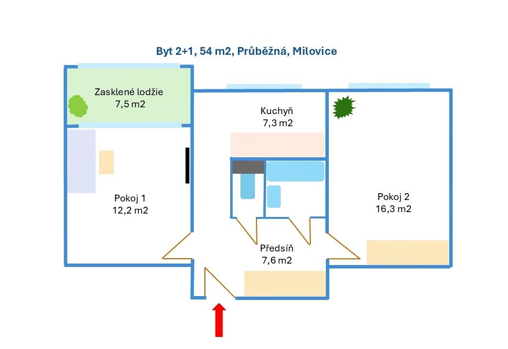 Nabízíme světlý a prostorný byt 2+1 o celkové užitné ploše 54 m navíc s velkou zasklenou lodžií o velikosti 7,5 m2 , umístěný ve 4. podlaží dobře udržovaného domu v oblíbené lokalitě Milovic.