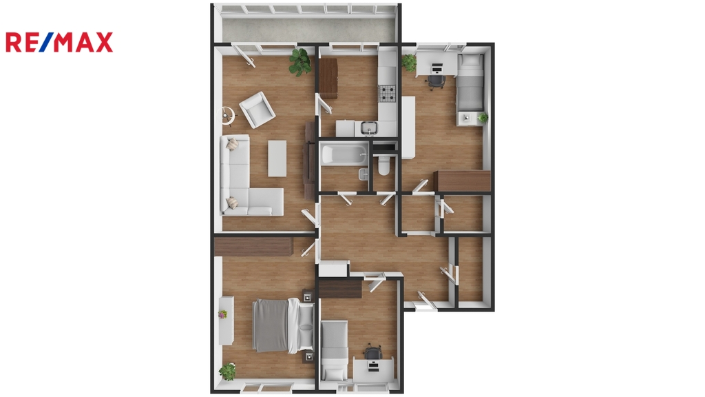 Centrem bytu je prostorná centrální chodba, odkud je samostatný vstup do všech pokojů. Hned u vchodu jsou 2 komory, využitelné jako šatna nebo pro uložení všeho potřebného. Dalčí úložné prostory jsou ve sklepě.