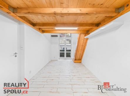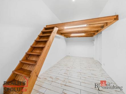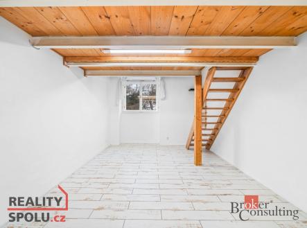 Jedno patro slouží klasicky jako prostor na spaní, druhé je řešeno velmi chytře – může fungovat jako pracovna, knihovna nebo klidová zóna (výška stropu od 150 cm do 180 cm) Ideální kombinace bydlení a home office, případně investiční využití.