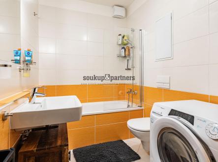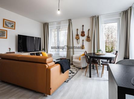 Byt je proveden v praktickém a udržovaném standardu. Součástí je plně vybavená kuchyňská linka Oresi s vestavěnými spotřebiči, včetně lednice s mrazákem, elektrické trouby, indukční varné desky, digestoře a myčky. Koupelna je vybavena vanou se sprchovou zástěnou, závěsným WC, umyvadlem se zrcadlem a přípojkou na pračku a sušičku. V obývacím pokoji s kuchyňským koutem je laminátová podlaha. Prostor kuchyně a obývacího pokoje je velmi dobře prosvětlen díky velkému množství francouzských oken a je z něj přímý vstup prostornou na terasu. V koupelně, chodbě a prostorné komoře je položena dlažba. Byt má interiérové dveře Sapelli včetně obložek, protipožární vstupní dveře a přípravu na instalaci předokenních žaluzií nebo rolet v ostění oken. V ložnici je vestavěná šatní skříň a kobercová podlaha.