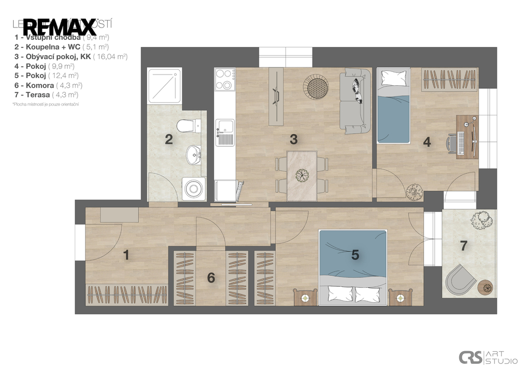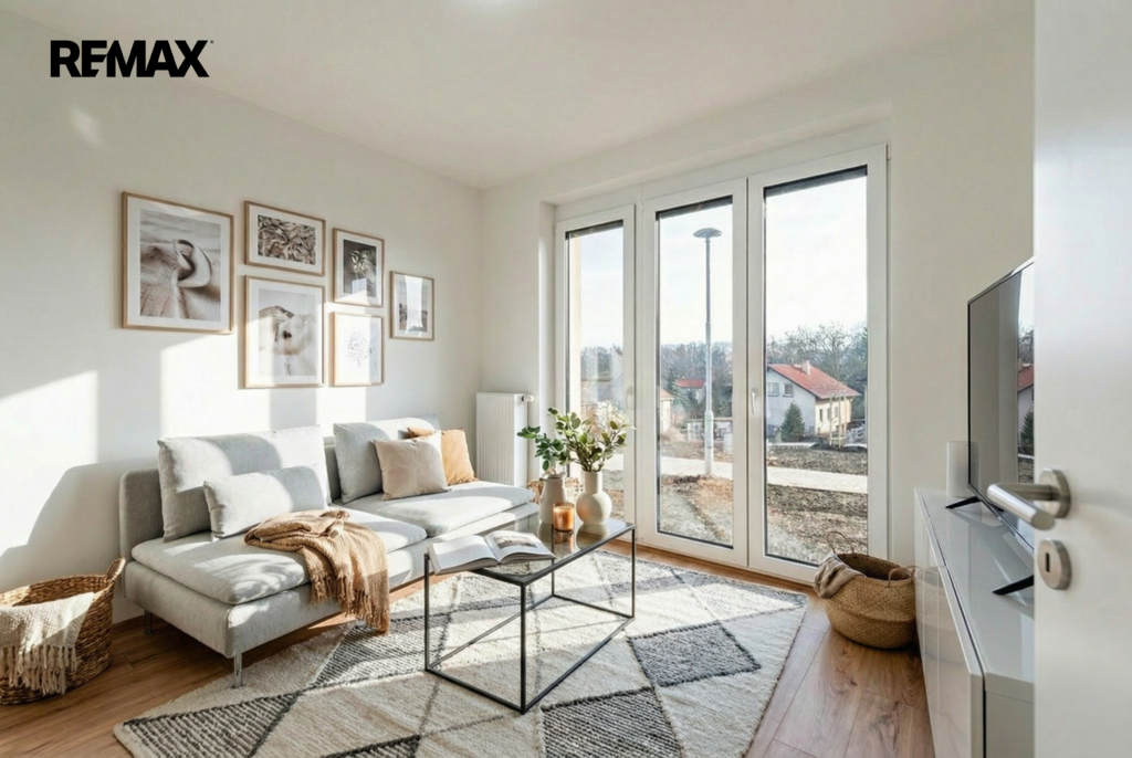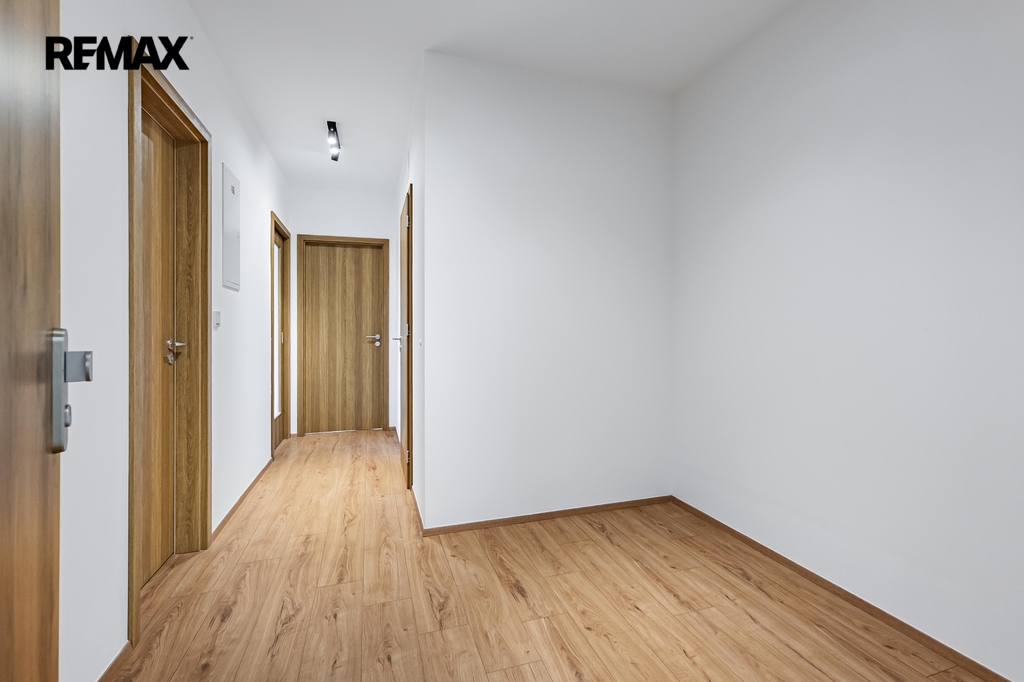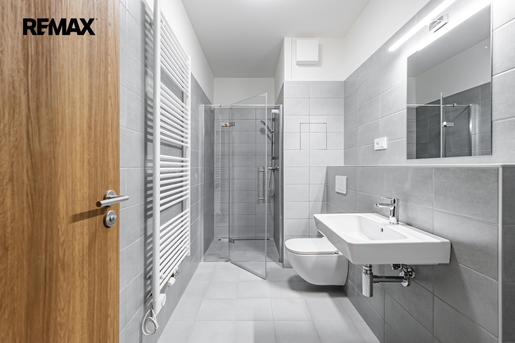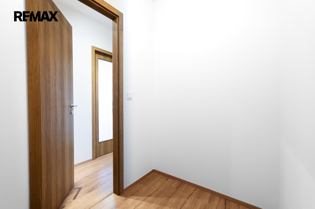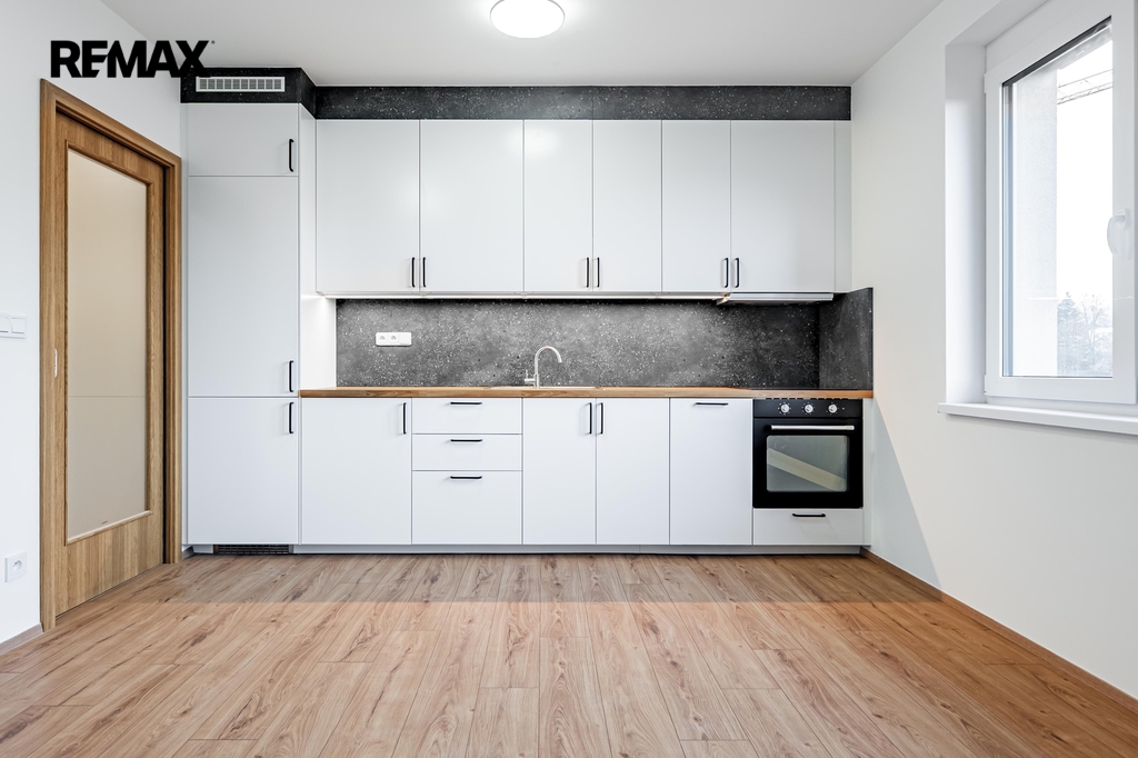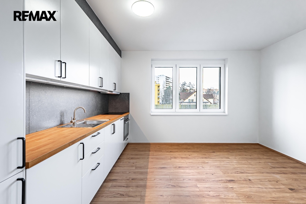 Vybavení bytu zahrnuje novou moderní kuchyňskou linku s vestavěnými spotřebiči (lednice, mrazák, indukční deska, trouba, myčka). V koupelně je prostorný sprchový kout, toaleta, umyvadlo, otopný žebřík a přípojka na pračku. Byt je prostorný a světlý díky velkým oknům. V předsíni najdete místo pro šatní skříň a komora přímo v bytu poskytne dostatek úložného prostoru.