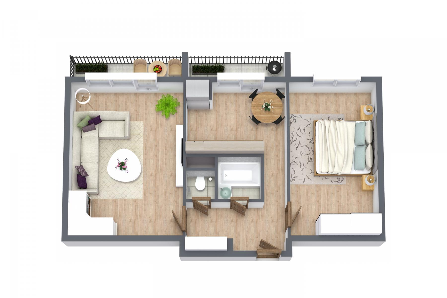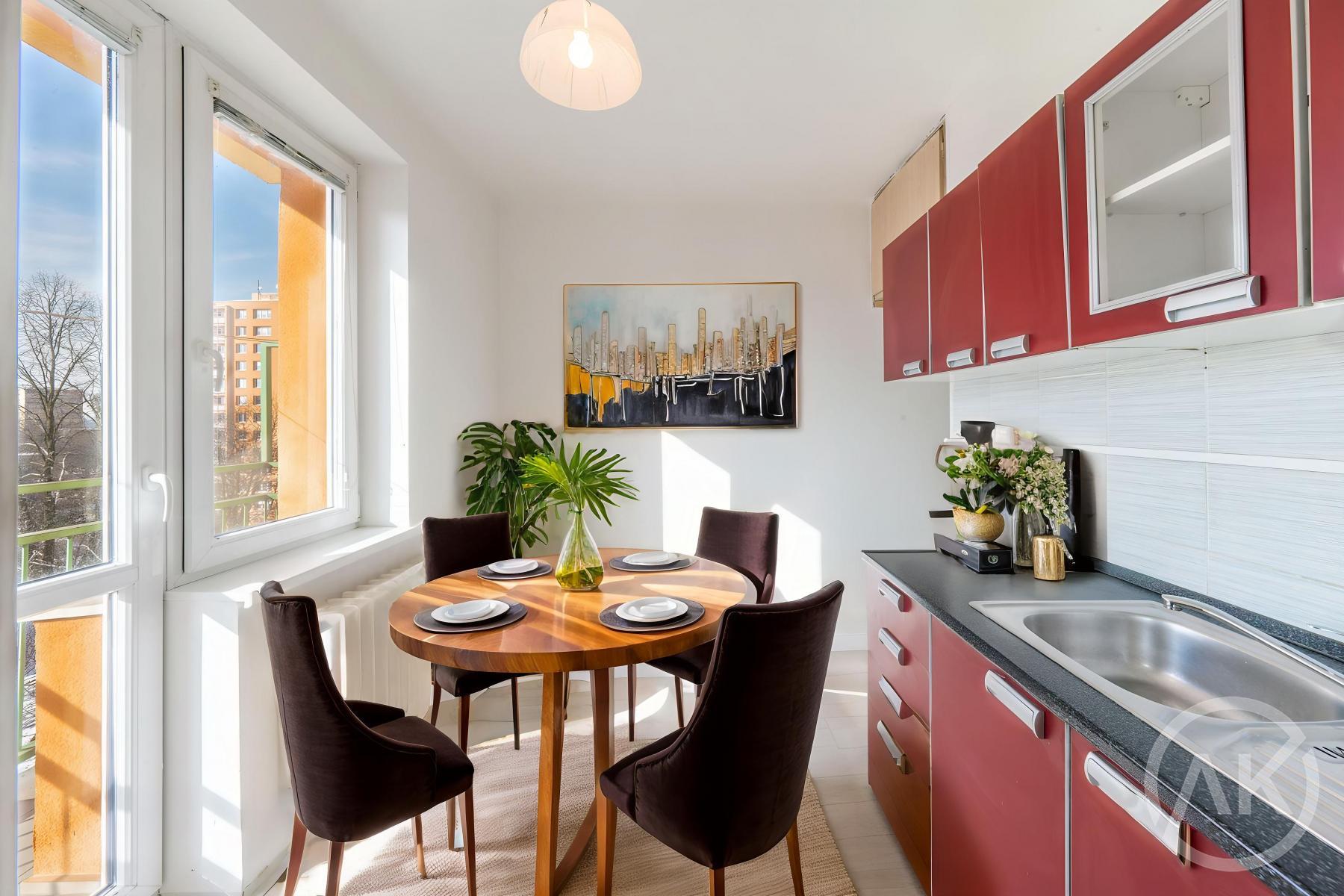 - nabízí se tady snadné propojení s obývacím pokojem. Tím, že jsou tady dva balkony, pak budeš mít jeden balkon z obýváku a druhý z kuchyně. Určitě je horší hádat bez balkonu, než o to, na který půjdeš trucovat,