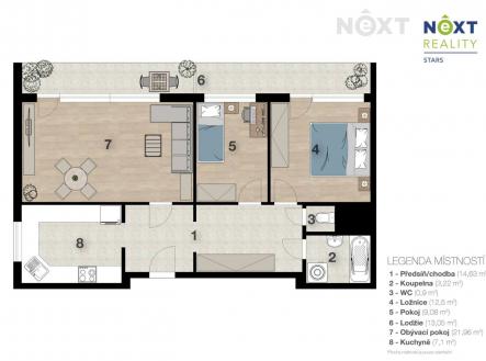 Byt prošel rekonstrukcí , plastová okna (moderní kuchyně, zděné jádro koupelny a toalety). V kuchyni, koupelně a na toaletě je položena dlažba. Velkou předností bytu jsou dvě zasklené lodžie o celkové ploše 13 m² (celková plocha činí 82 m2 ), orientované na severní stranu, odkud se otevírá příjemný výhled až na Pražský hrad.