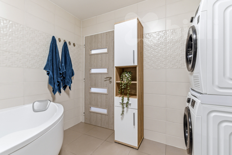 Jednotka je slunná a nabízí příjemný otevřený prostor - obývací pokoj je propojený s kuchyní. Dále zde najdete dva samostatné pokoje, zvětšenou koupelnu s rohovou vanou a místem pro pračku i sušičku. Na chodbě se nachází praktická komora.
