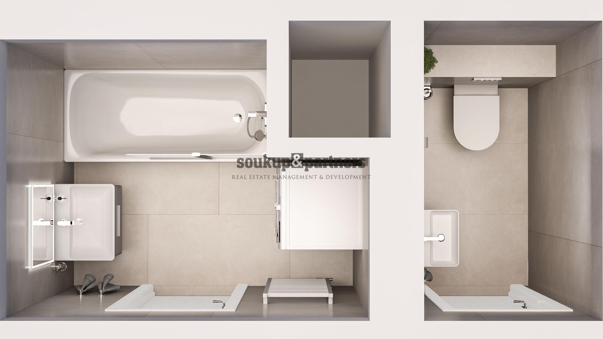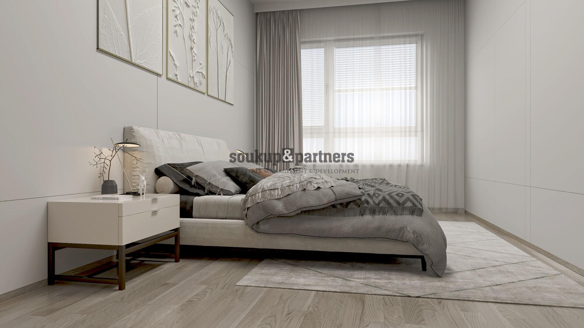 Byt se bude předávat ve vysokém standardu zahrnujícím velkoformátové obklady RAKO Betonico, odolné laminátové podlahy, kvalitní sanitu a baterie, bezpečnostní vstupní dveře v třídě 3, interiérové dveře výrobce Sapeli, izolační trojskla a přípravu na venkovní žaluzie.