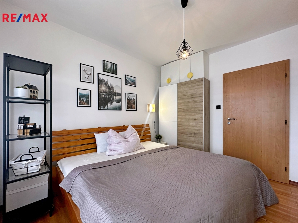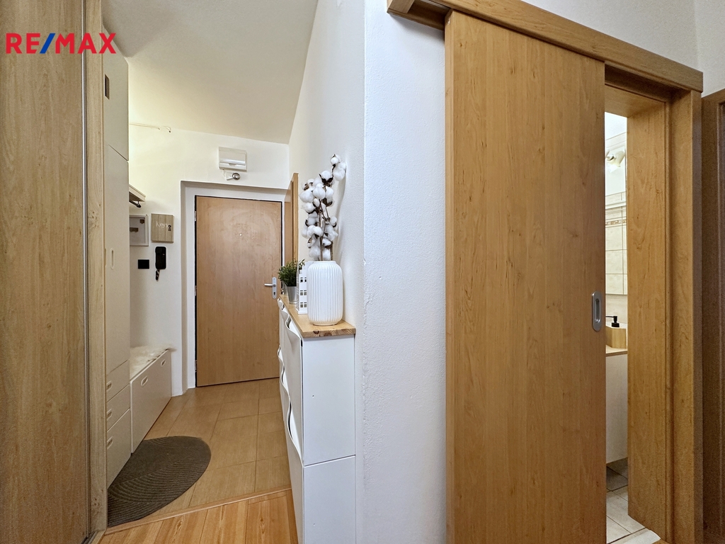 Dispozice zahrnuje samostatnou koupelnu a toaletu, přičemž výhodou jsou také vestavné skříně v předsíni i ložnici. Byt se prodává včetně vybavení, jehož součástí je i kuchyňská linka s novými chytrými spotřebiči. Vstup do bytu je zabezpečen protipožárními dveřmi.