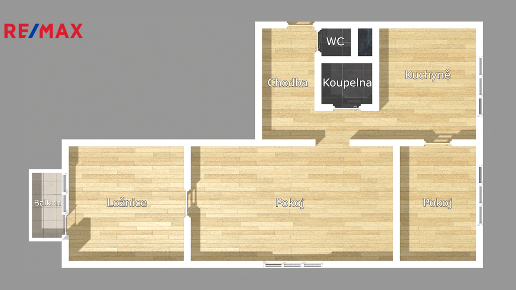 Byt o celkové výměře 65,11 m² doplňuje balkon o ploše 4,32 m² a prostorný sklep cca 5 m². Nabízí praktické dispoziční řešení a příjemnou orientaci na tři světové strany – obývací pokoj na jih, kuchyně a pokoj na východ a ložnice s balkonem na západ.