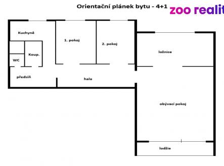 Byt disponuje vstupní chodbou, halou, kuchyní, dvěma dětskými pokoji, obývákem s lodžií a ložnicí.