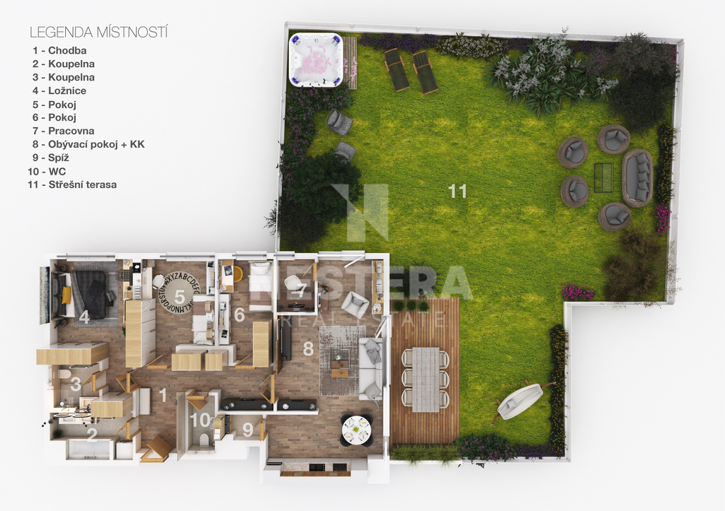 Nabízíme postoupení nového družstevního bytu s aktuální dispozicí 5+kk s podlahovou plochou 115 m² s terasou 20 m² a zahradou o ploše 201 m², která poskytuje výjimečný prostor pro relaxaci, zahradničení či soukromé posezení.
