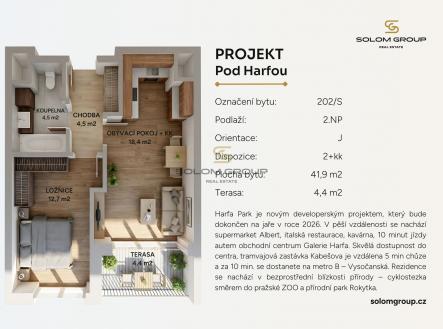 Prodej nového bytu 2+kk o velikosti 41,9 m² + terasa 4,4 m², který se nachází ve 2. NP cihlové novostavby v rezidenci Harfa Park (dům S).