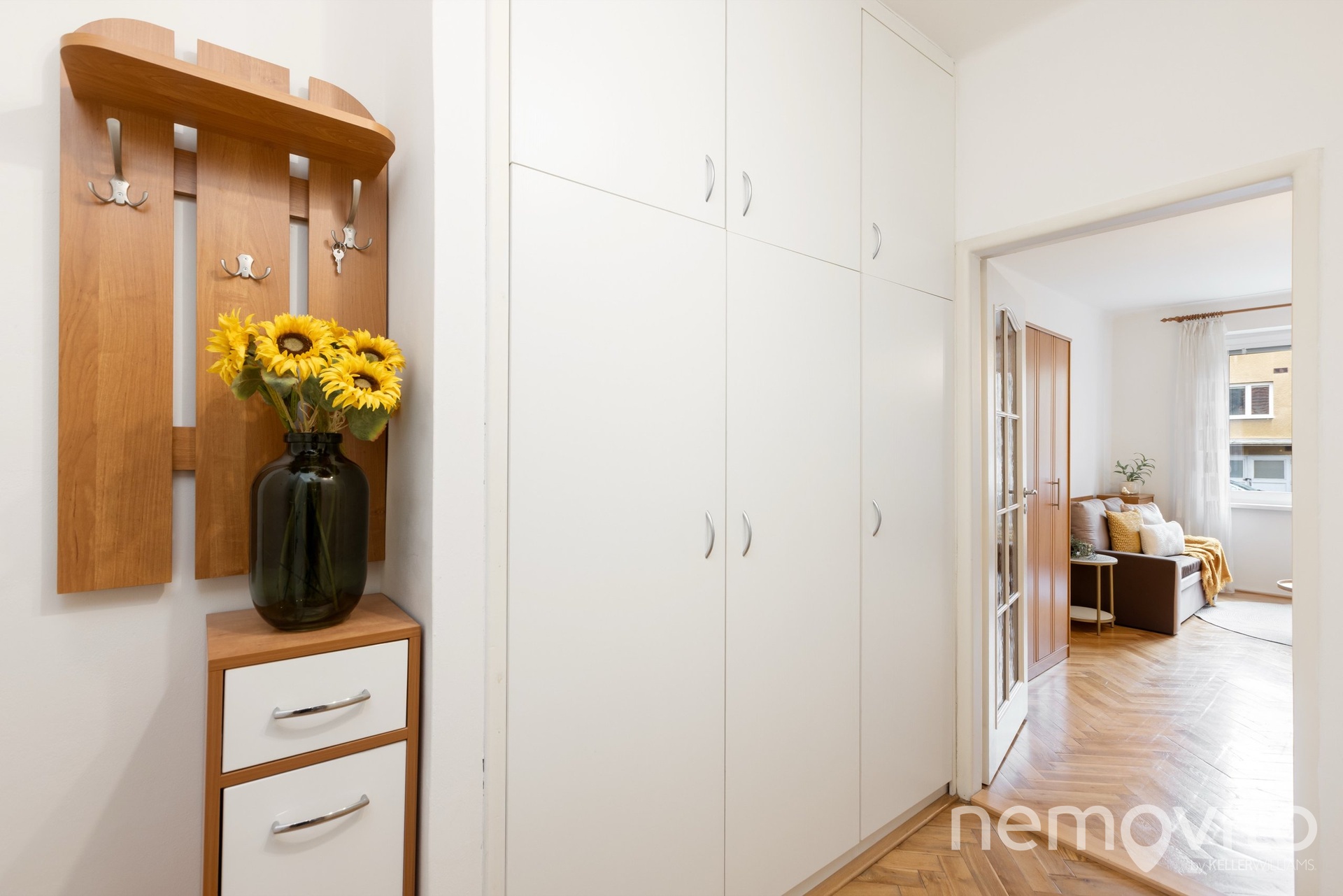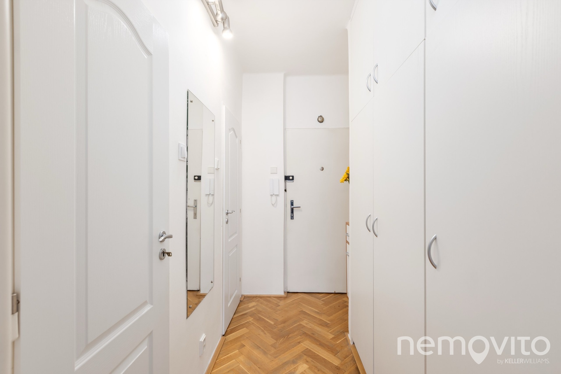 Nachází se ve třetím podlaží bez výtahu a k dispozici je částečně zařízený. Byt prošel v roce 2012 rekonstrukcí, která obnášela nové rozvody elektřiny, novou koupelnu, přesun kuchyně z chodby do hlavní místnosti a renovaci původních dřevěných parket. Hlavní místnost má pravidelný půdorys 4x5 metrů a díky velkému oknu i vyšším stropům (2,7 m) působí příjemně.