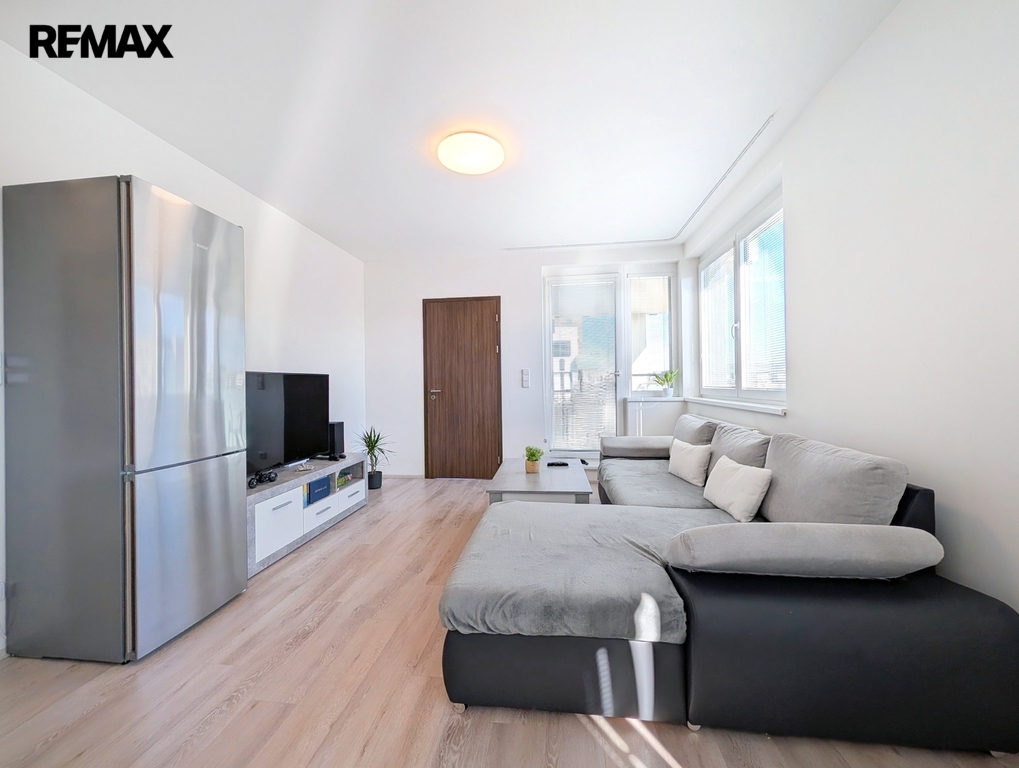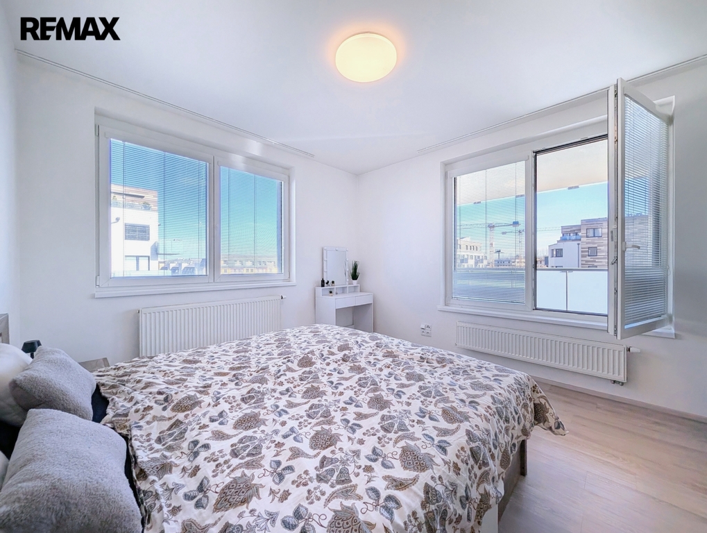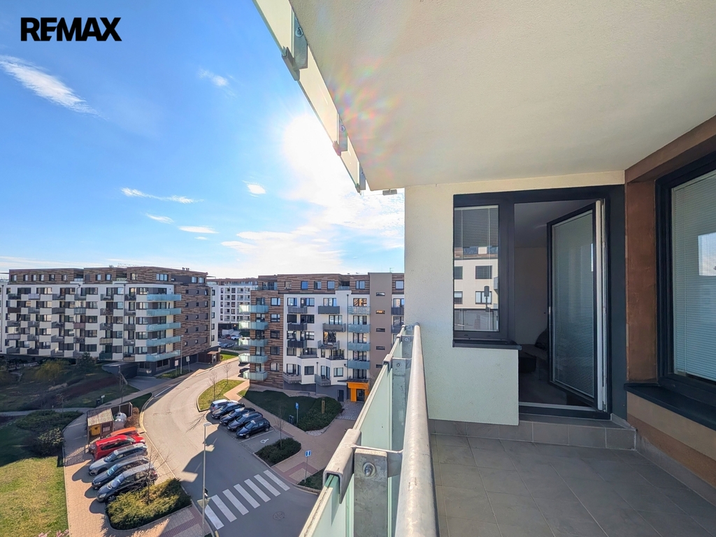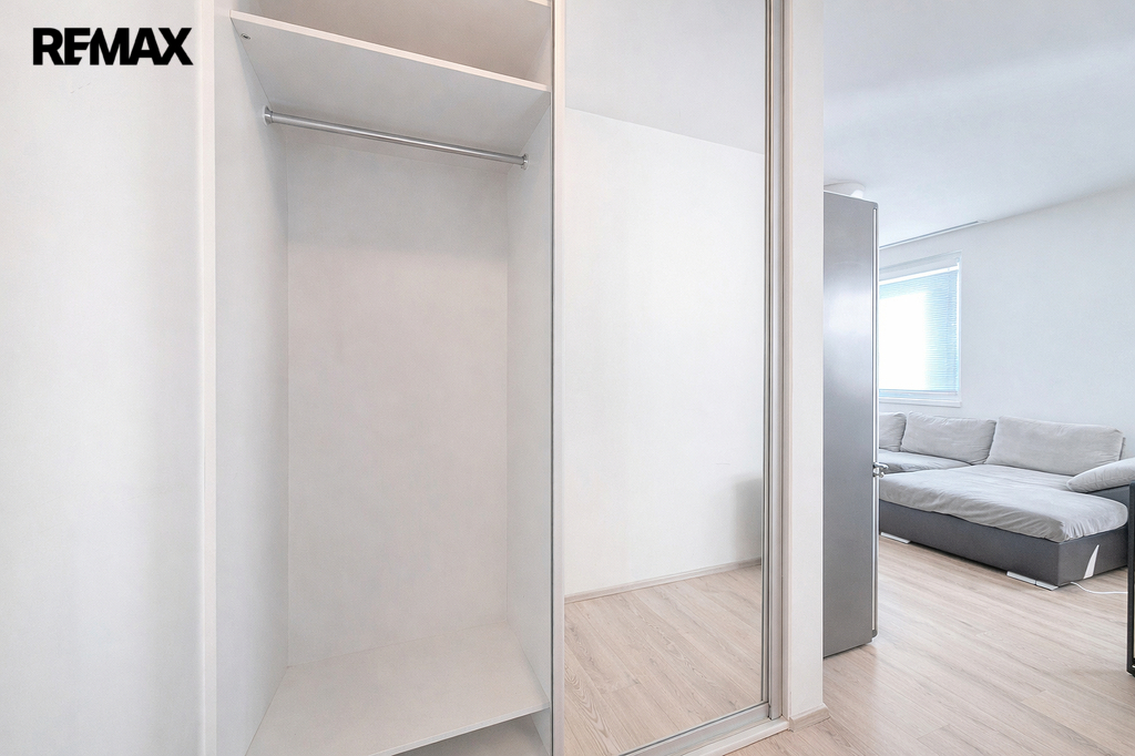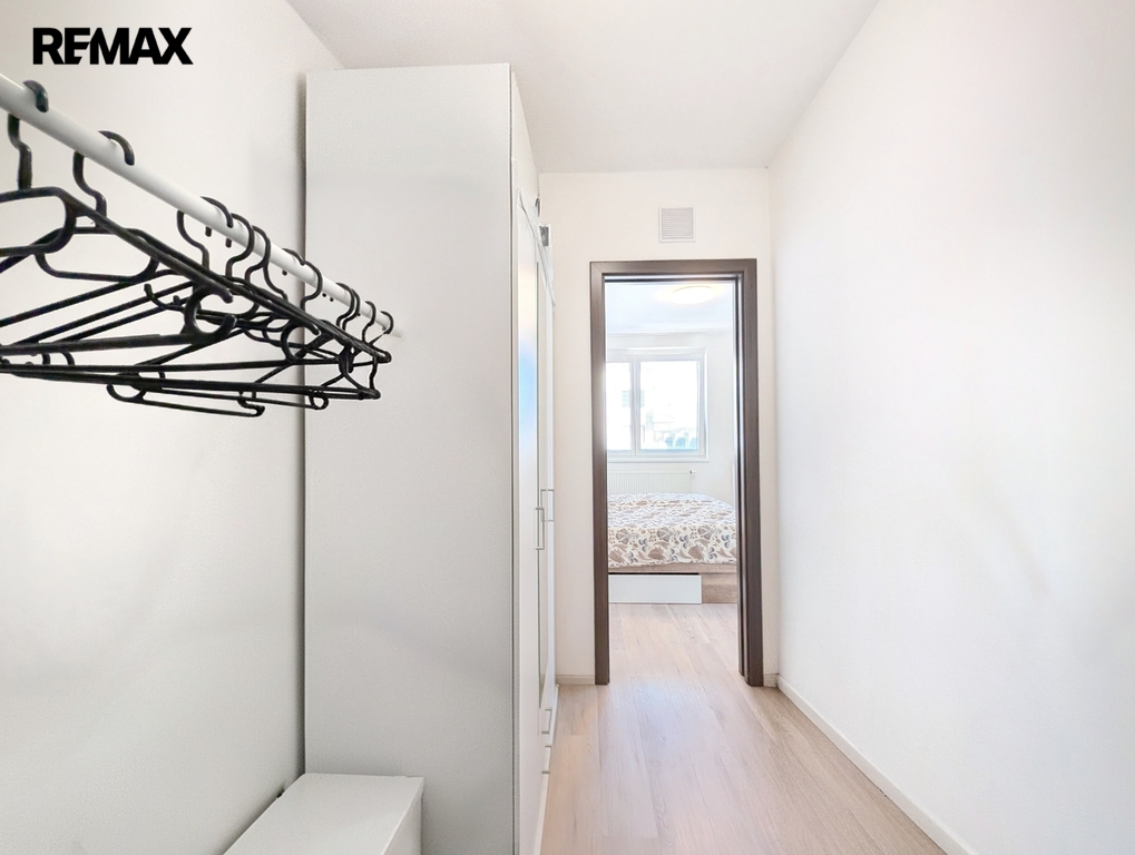 Dispozice je řešena velmi efektivně – obývací pokoj se zařízeným kuchyňským koutem a přímým vstupem na balkón, samostatná ložnice s přístupem do šatny, prostorná chodba a koupelna s vanou a otopným žebříkem. Velkým benefitem jsou úložné prostory řešené na míru, které dávají bytu nadstandardní funkčnost pro každodenní život. Díky orientaci na více světových stran (jih, východ, západ) je byt přirozeně světlý a vzdušný po celý den.