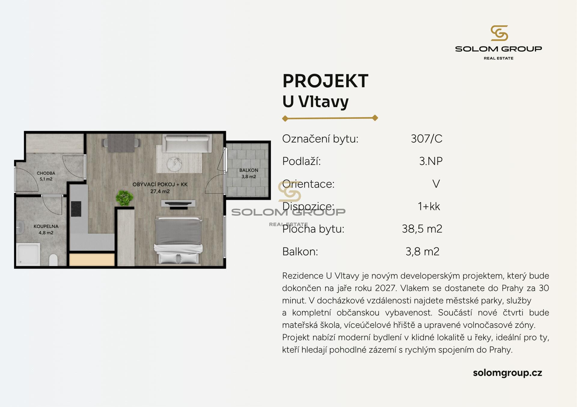 Prodej NOVÉHO bytu 2+kk, 42,3 m² (byt o výměře 38,5 m² + balkon o výměře 3,8 m²), který se nachází ve 3. NP cihlové novostavby v Rezidenci U Vltavy, Kralupy nad Vltavou (Dům C)