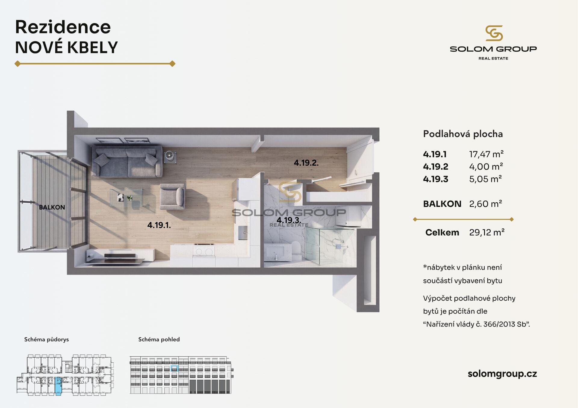 Prodej NOVÉHO bytu 1+kk, 29,12 m² (byt o výměře 26,52 m² + balkon o výměře 2,60 m²) který se nachází ve 4. NP cihlové novostavby v Rezidenci Nové Kbely, Praha – Kbely.