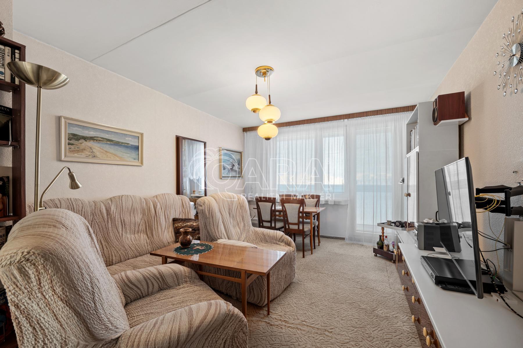 Byt se nachází v 8. patře, v posledním patře, revitalizovaného domu, má čtyři neprůchozí pokoje, včetně velkého obývacího pokoje, kuchyň, koupelnu, samostatnou toaletu, zasklenou lodžii, navíc přikoupenou vstupní předsíň s komorou a zděný sklep. Dispozice bytu je situována jako dvougenerační, kde u pokoje ( samostatné garsonky je příprava na koupelnu s wc - v současné době je zde fotokomora. Poslední 7. patro zajišťuje z lodžie příjemný výhled. Plastová okna zajišťují příjemný tepelný komfort a přispívají k úsporám energií. V bytě je zavedeno ústřední dálkové vytápění s rozvodem tepla do radiátorů.