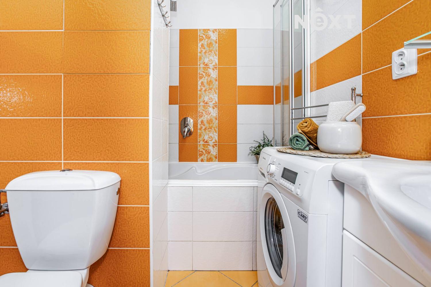 Z chodby vstupujeme do koupelny o velikosti 3,7 m², která je prakticky řešená – najdete zde vanu, prostor pro pračku i vše potřebné pro každodenní fungování. Toaleta je samostatná, což zvyšuje komfort při běžném provozu domácnosti.