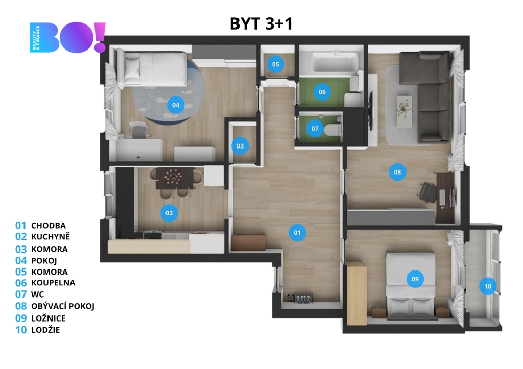 - praktickou dispozici s prostorným obývacím pokojem